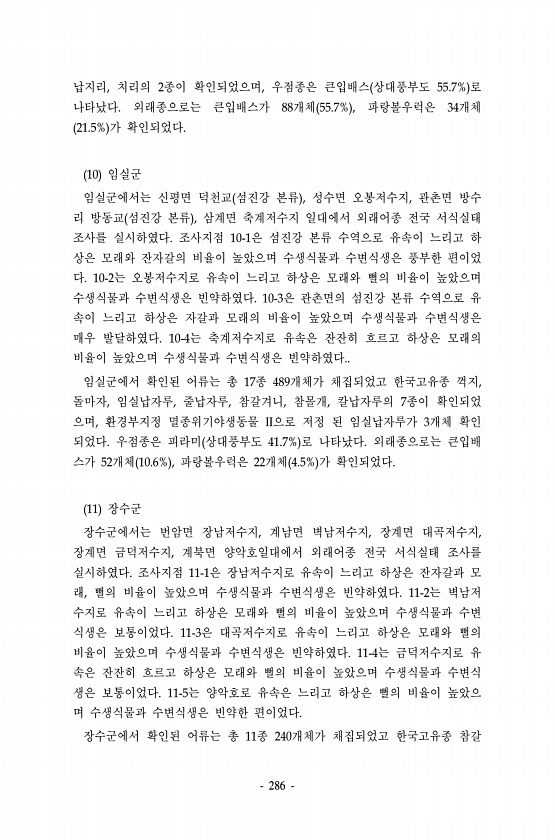 286 납지리, 치리의 2종이 확인되었으며, 우점종은 큰입배스 상대풍부도 55.7% 로 나타났다. 외래종으로는 큰입배스가 88개체 55.7% , 파랑볼우럭은 34개체 21.5% 가 확인되었다. 10 임실군 임실군에서는 신평면 덕천교 섬진강 본류 , 성수면 오봉저수지, 관촌면 방수 리 방동교 섬진강 본류 , 삼계면 축계저수지 일대에서 외래어종 전국 서식실태 조사를 실시하였다. 조사지점 10-1은 섬진강 본류 수역으로 유속이 느리고 하 상은 모래와 잔자갈의 비율이 높았으며 수생식물과 수변식생은 풍부한 편이었 다. 10-2는 오봉저수지로 유속이 느리고 하상은 모래와 뻘의 비율이 높았으며 수생식물과 수변식생은 빈약하였다. 10-3은 관촌면의 섬진강 본류 수역으로 유 속이 느리고 하상은 자갈과 모래의 비율이 높았으며...