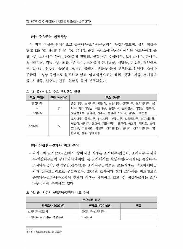 2016 전국 특정도서 정밀조사 옹진-남부권역 292 ? National Institute of Ecology 마 주요군락 변동사항 이 지역 식생은 전체적으로 졸참나무-소사나무군락이 우점하였으며, 섬의 정상주 변 E 126。0134.8N 35。0217.1, 졸참나무-소사나무군락에서는 아교목층에 졸 참나무, 소사나무 등이, 관목층에 진달래, 신갈나무, 산벚나무, 보리밥나무, 음나무, 청미래덩굴, 쥐똥나무, 졸참나무 등이, 초본층에 큰개별꽃, 개별꽃, 현호색, 댓잎현호 색, 말나리, 원추리, 둥굴레, 으아리, 줄딸기, 맥문동 등이 분포하고 있었다. 소사나 무군락이 정상 주변으로 분포하고 있고, 암벽식생으로는 해국, 갯강아지풀, 갯기름나 물, 사철쑥, 원추리, 인동, 천남성 등이 분포하였다. 표 43. 중바지섬의...