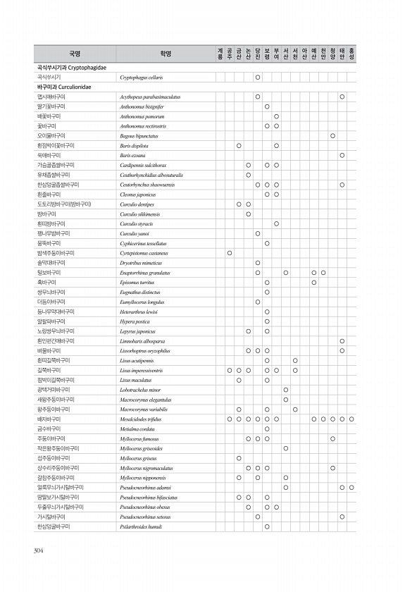 304 곡식쑤시기과 Cryptophagidae 곡식쑤시기 Cryptophagus cellaris ○ 바구미과 Curculionidae 맵시애바구미 Acythopeus parabasimaculatus ○ ○ 딸기꽃바구미 Anthonomus bisignifer ○ 배꽃바구미 Anthonomus pomorum ○ 꽃바구미 Anthonomus rectirostris ○ ○ 오이물바구미 Bagous bipunctatus ○ 흰점박이꽃바구미 Baris dispilota ○ ○ 쑥애바구미 Baris ezoana ○ 가슴골좁쌀바구미 Cardipennis sulcithorax ○ ○ ○ 유채좁쌀바구미 Ceuthorhynchidius albosuturalis ○ 한삼덩굴좁쌀바구미 Ceutorhynchus shaowuensis...