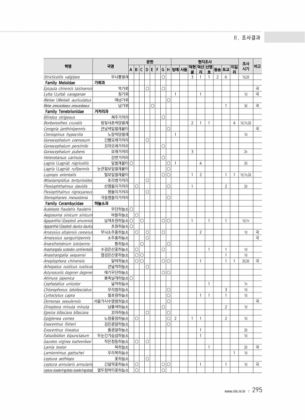 Ⅱ. 조사결과 www.nie.re.kr ? 295 학명 국명 문헌 현지조사 조사 A B C D E F G H 빙애 사동 덕현 시기 비고 골 덕산 리 산명 호 동송 토교 이길 리 Stricticollis valgipes 무늬뿔벌레 ○ 3 1 1 2 6 1d,2d Family Meloidae 가뢰과 Epicauta chinensis taishoensis 먹가뢰 ○ ○ 국 Lytta Lytta caraganae 청가뢰 1 1 1d 국 Meloe Meloe auriculatus 애남가뢰 ○ Meloe proscarabaeus proscarabaeus 남가뢰 ○ 1 3d 국 Family Tenebrionidae 거저리과 Blindus strigosus 제주거저리 ○ Borboresthes cruralis 밤빛사촌썩덩...