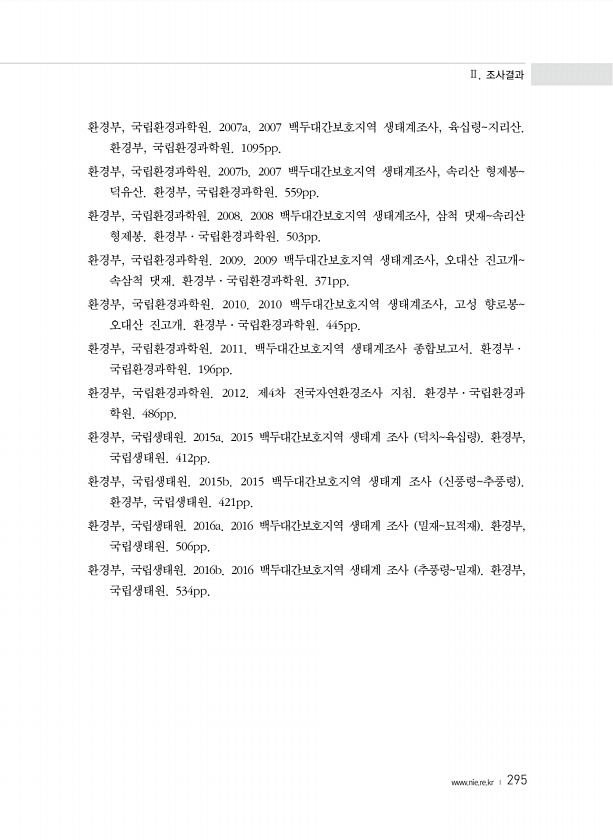 Ⅱ. 조사결과 www.nie.re.kr ? 295 환경부, 국립환경과학원. 2007a. 2007 백두대간보호지역 생태계조사, 육십령지리산. 환경부, 국립환경과학원. 1095pp. 환경부, 국립환경과학원. 2007b. 2007 백두대간보호지역 생태계조사, 속리산 형제봉덕유산. 환경부, 국립환경과학원. 559pp. 환경부, 국립환경과학원. 2008. 2008 백두대간보호지역 생태계조사, 삼척 댓재속리산 형제봉. 환경부·국립환경과학원. 503pp. 환경부, 국립환경과학원. 2009. 2009 백두대간보호지역 생태계조사, 오대산 진고개속삼척 댓재. 환경부·국립환경과학원. 371pp. 환경부, 국립환경과학원. 2010. 2010 백두대간보호지역 생태계조사, 고성 향로봉오대산 진고개. 환경부·국립환경과학원. 445pp...