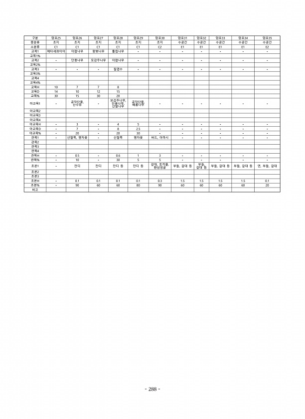 구분 망포25 망포26 망포27 망포28 망포29 망포30 망포31 망포32 망포33 망포34 망포35 중분류 초지 초지 초지 초지 초지 초지 수공간 수공간 수공간 수공간 수공간 소분류 C1 C1 C1 C1 C1 C2 E1 E1 E1 E1 E2 교목1 메타세콰이어 이팝나무 왕벚나무 튤립나무 교목1% 교목2 단풍나무 모감주나무 이팝나무 교목2% 교목3 칠엽수 교목3% 교목4 교목4% 교목H 10 7 7 8 교목D 14 10 12 15 교목% 30 15 30 20 아교목1 공작단풍, 산수유 모감주나무, 단풍나무, 산딸나무 공작단풍, 배롱나무 아교목2 아교목3 아교목4 아교목H 3 4 5 아교목D 7 8 2.5 아교목% 20 20 30 관목1 산철쭉, 명자꽃 산철쭉 명자꽃 버드, 아까시 관목2 관목3 관목4 관목...
