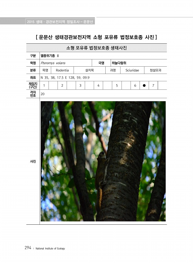 2015 생태·경관보전지역 정밀조사 운문산 294 ? National Institute of Ecology [ 운문산 생태경관보전지역 소형 포유류 법정보호종 사진 ] 소형 포유류 법정보호종 생태사진 구분 멸종위기종 Ⅱ 학명 Pteromys volans 국명 하늘다람쥐 분류 목명 Rodentia 설치목 과명 Sciuridae 청설모과 좌표 N 35, 38, 17.5 E 128, 59, 09.9 채집지 구간 1 2 3 4 5 6 ● 7 격자 번호 20사진