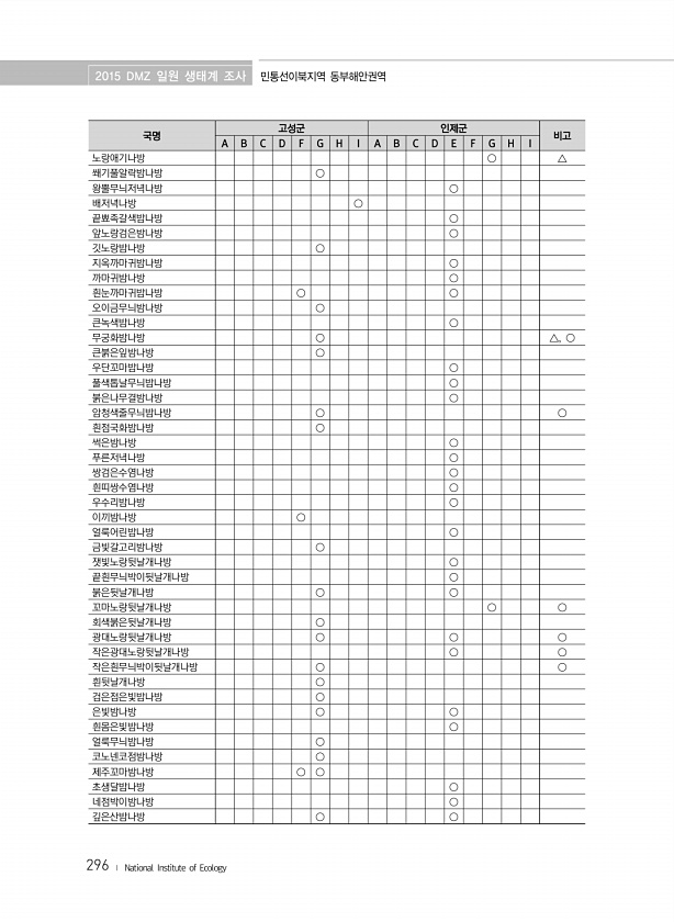 2015 DMZ 일원 생태계 조사 민통선이북지역 동부해안권역 296 ? National Institute of Ecology 국명 고성군 인제군 비고 A B C D F G H I A B C D E F G H I 노랑애기나방 ○ △ 쐐기풀알락밤나방 ○ 왕뿔무늬저녁나방 ○ 배저녁나방 ○ 끝뾰족갈색밤나방 ○ 앞노랑검은밤나방 ○ 깃노랑밤나방 ○ 지옥까마귀밤나방 ○ 까마귀밤나방 ○ 흰눈까마귀밤나방 ○ ○ 오이금무늬밤나방 ○ 큰녹색밤나방 ○ 무궁화밤나방 ○ △, ○ 큰붉은잎밤나방 ○ 우단꼬마밤나방 ○ 풀색톱날무늬밤나방 ○ 붉은나무결밤나방 ○ 암청색줄무늬밤나방 ○ ○ 흰점국화밤나방 ○ 썩은밤나방 ○ 푸른저녁나방 ○ 쌍검은수염나방 ○ 흰띠쌍수염나방 ○ 우수리밤나방 ○ 이끼밤나방 ○ 얼룩어린밤나방 ○ 금빛갈고리밤나방 ○ 잿...