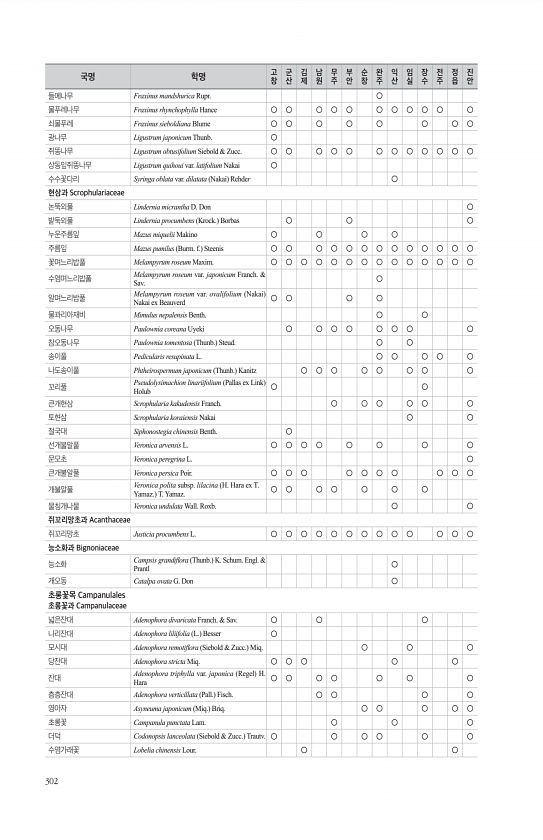 302 들메나무 Fraxinus mandshurica Rupr. ○ 물푸레나무 Fraxinus rhynchophylla Hance ○ ○ ○ ○ ○ ○ ○ ○ ○ ○ ○ 쇠물푸레 Fraxinus sieboldiana Blume ○ ○ ○ ○ ○ ○ ○ ○ 광나무 Ligustrum japonicum Thunb. ○ 쥐똥나무 Ligustrum obtusifolium Siebold & Zucc. ○ ○ ○ ○ ○ ○ ○ ○ ○ ○ ○ ○ 상동잎쥐똥나무 Ligustrum quihoui var. latifolium Nakai ○ 수수꽃다리 Syringa oblata var. dilatata Nakai Rehder ○ 현삼과 Scrophulariaceae 논뚝외풀 Lindernia micrantha D. Don ○ 밭...