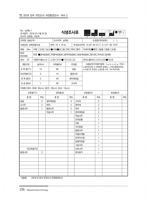 2018 전국 무인도서 자연환경조사 여수 2 296 ? National Institute of Ecology No 납계도 1 조사일자 2018 년 4 월 24 일 조사자김현돈, 서상욱 식생조사표 군락명곰솔군락 조사지역납계도 도엽명 격자번호 식생상관상록침엽수림 면적15 × 15 ㎡ 위?경도 GPS N 34° 4557.1, E 127° 3019.0해발30m 지형□산정 □능선 ■사면 ■상□중□하 □계곡□평지 미세지형■평면 □돌출 □함몰 □요철 방위NW300 토양■갈색삼림토□적황색삼림토□암적색삼림토□회갈색삼림토□침식토□미숙토□암쇄토 경사10° 낙엽부식층 cm □.≥20 □ 15 ■ 10 □ 5 □0 암석노출 % □≥51□ 25■ 5□0 계층구분 높이 m 식피율 % 우점종 식생보전가치평가항목 a, b, c, d, e...