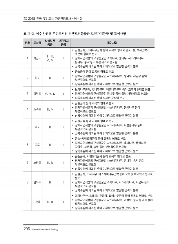 2018 전국 무인도서 자연환경조사 여수 3 296 ? National Institute of Ecology 번호 도서명 식생보전 등급 보전가치 등급 특이사항 1 서근도 Ⅲ, Ⅲ, Ⅴ, Ⅴ Ⅱ ? 곰솔군락, 소사나무군락 등이 교목의 형태로 분포, 칡, 초지군락이 초본의 형태로 분포. ? 잠재자연식생의 구성종군인 소사나무, 팽나무, 사스레피나무, 돈나무, 송악 등이 부분적으로 분포함 ? 상록수림이 파괴된 후에 2 차적으로 발달한 군락이 분포 2 취도 Ⅲ Ⅱ ? 곰솔군락 등이 교목의 형태로 분포 ? 잠재자연식생의 구성종군인 사스레피나무, 팽나무, 자금우 등이 부분적으로 분포함 ? 상록수림이 파괴된 후에 2 차적으로 발달한 군락이 분포 3 까막섬 Ⅳ, Ⅳ, Ⅳ Ⅲ ? 느티나무군락, 벚나무군락, 버즘나무군락 등이 ...