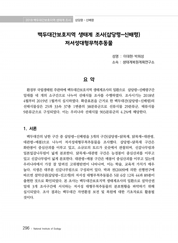제목 : (2018) 백두대간보호지역 생태계 조사.삽당령~신배령
