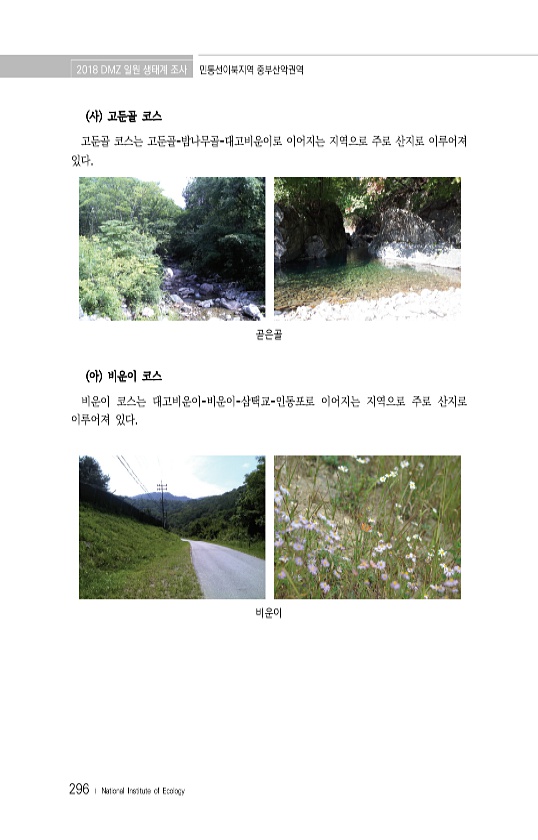 2018 DMZ 일원 생태계 조사 민통선이북지역 중부산악권역 296 ? National Institute of Ecology 사 고둔골 코스 고둔골 코스는 고둔골-밤나무골-대고비운이로 이어지는 지역으로 주로 산지로 이루어져 있다. 곧은골 아 비운이 코스 비운이 코스는 대고비운이-비운이-삼택교-인동포로 이어지는 지역으로 주로 산지로 이루어져 있다.비운이