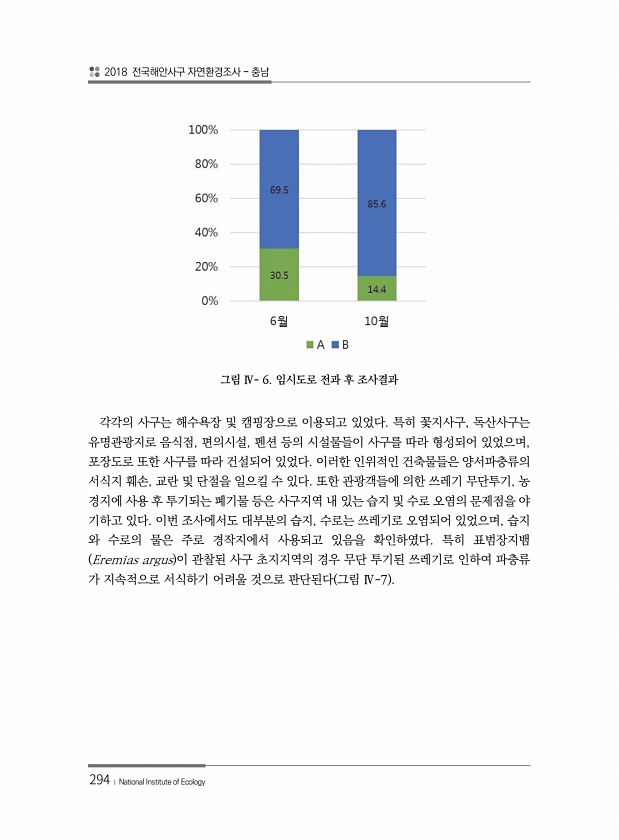 2018 전국해안사구 자연환경조사 충남 294 ? National Institute of Ecology 그림 Ⅳ- 6. 임시도로 전과 후 조사결과 각각의 사구는 해수욕장 및 캠핑장으로 이용되고 있었다. 특히 꽃지사구, 독산사구는 유명관광지로 음식점, 편의시설, 펜션 등의 시설물들이 사구를 따라 형성되어 있었으며, 포장도로 또한 사구를 따라 건설되어 있었다. 이러한 인위적인 건축물들은 양서파충류의 서식지 훼손, 교란 및 단절을 일으킬 수 있다. 또한 관광객들에 의한 쓰레기 무단투기, 농 경지에 사용 후 투기되는 폐기물 등은 사구지역 내 있는 습지 및 수로 오염의 문제점을 야 기하고 있다. 이번 조사에서도 대부분의 습지, 수로는 쓰레기로 오염되어 있었으며, 습지 와 수로의 물은 주로 경작지에서 사용되고 있음을 ...