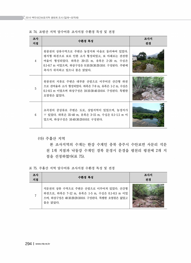 2016 백두대간보호지역 생태계 조사 밀재묘적재 294Ⅰwww.nie.re.kr 조사 지점 수환경 특성 조전사경지 7 석문천의 상류 수역으로 주변은 산림으로 이루어져 있었다. 산간형 하천으로, 하폭은 712 m, 유폭은 15 m, 수심은 0.10.5 m 이었 으며, 하상구성은 40102020100로 구성된다. 특별한 오염원은 없었고 물은 맑았다. 표 74. 조령산 지역 담수어류 조사지점 수환경 특성 및 전경 조사 지점 수환경 특성 조전사경지 4 원풍천의 상류수역으로 주변은 농경지와 마을로 둘러싸여 있었다. 평지형 하천으로 보로 인한 소가 형성되었고, 보 아래로는 잔잔한 여울이 형성되었다. 하폭은 2025 m, 유폭은 220 m, 수심은 0.10.7 m 이었으며, 하상구성은 01030302010로 구성된다. ...