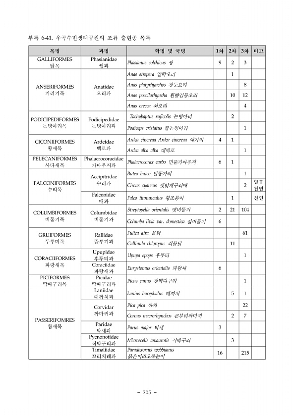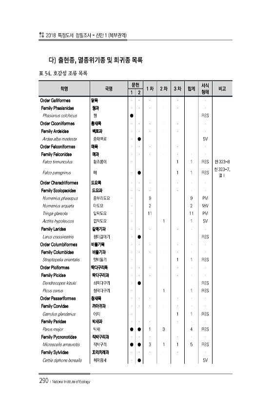 2018 특정도서 정밀조사 신안 1 북부권역 290 ? National Institute of Ecology , 학명 국명 문헌 1 차 2 차 3 차 합계 서식 1 2 형태 비고 Order Galliformes 닭목 Family Phasianidae 꿩과 Phasianus colchicus 꿩 ● RES Order Ciconiiformes 황새목 Family Ardeidae 백로과 Ardea alba modesta 중대백로 ● SV Order Falconiformes 매목 Family Falconidae 매과 Falco tinnunculus 황조롱이 1 1 RES 천 323-8 Falco peregrinus 매 ● 1 1 RES 천 323-7, 멸Ⅰ Order Charadriiformes 도요목 ...