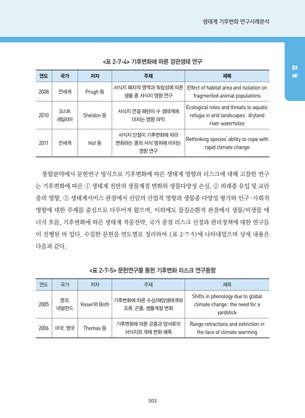 303 생태계 기후변화 연구사례분석 통 합 표 2-7-4 기후변화에 따른 경관생태 연구 연도 국가 저자 주제 제목 2008 전세계 Prugh 등 서식지 패치의 영역과 독립성에 따른 생물 종 서식지 영향 연구 Effect of habitat area and isolation on fragmented animal populations 2010 오스트 레일리아 Sheldon 등 서식지 연결 패턴이 수 생태계에 미치는 영향 파악 Ecological roles and threats to aquatic refugia in arid landscapesdryland river waterholes 2011 전세계 Hof 등 서식지 단절이 기후변화에 따라 변화하는 종의 서식 범위에 미치는 영향 연구 Rethinking spe...