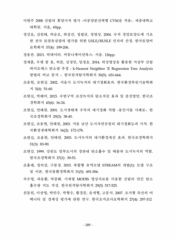 이현주 2008 산림의 휴양가치 평가 -이중양분선택형 CVM을 적용-. 세종대학교 대학원. 서울, 69pp. 정강호, 김원태, 허승오, 하상건, 정필균, 정영상. 2004. 수치 정밀토양도에 기초 한 전국 토양유실량의 평가를 위한 USLE/RUSLE 인자의 산정. 한국토양비 료학회지 37 4 199-206. 정용찬. 2013. 빅데이터. 커뮤니케이션북스서울. 126pp. 정재훈, 우엔 콩 효, 허준, 김경민, 임정호. 2014. 위성영상을 활용한 지상부 산림 바이오매스 탄소량 추정 k-Nearest Neighbor 및 Regression Tree Analysis 방법의 비교 분석 -. 한국원격탐사학회지 30 5 651-664. 조용현, 조현길. 2002. 서울시 도시녹지의 대기정화효과. 한국환경복원기술학회 ...