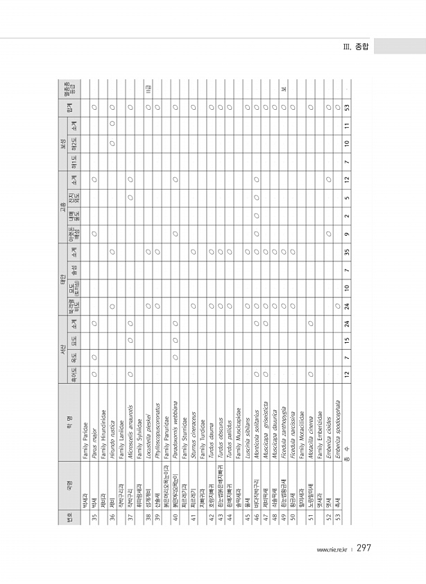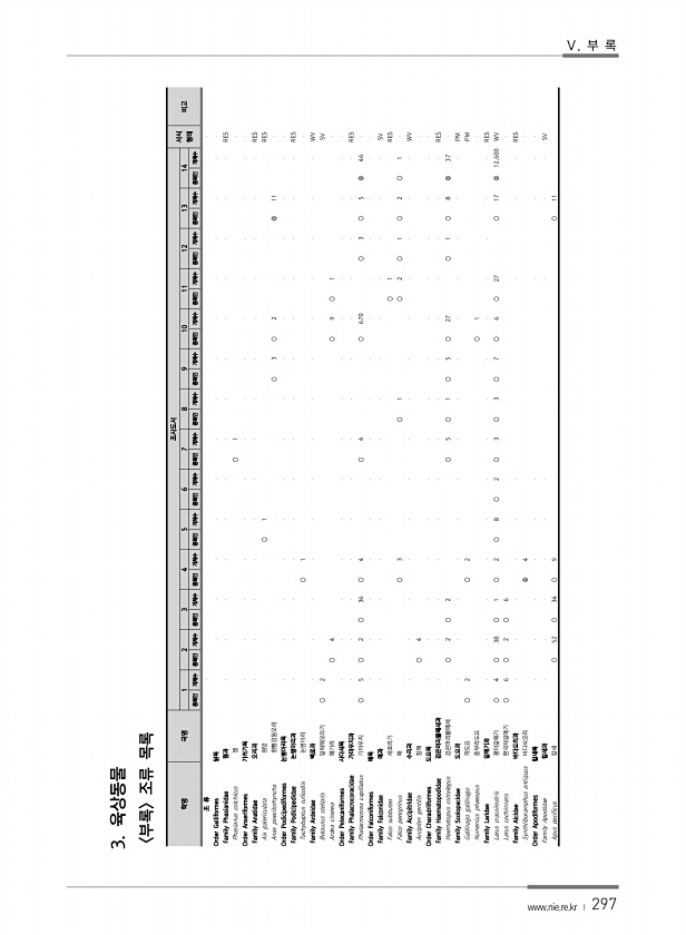 www.nie.re.kr ? 297 3. 육상동물 부록 조류 목록 학명 국명 조사도서 서식 형태 1 2 3 4 5 6 7 8 9 10 11 12 13 14 비고 종확인 개체수 종확인 개체수 종확인 개체수 종확인 개체수 종확인 개체수 종확인 개체수 종확인 개체수 종확인 개체수 종확인 개체수 종확인 개체수 종확인 개체수 종확인 개체수 종확인 개체수 종확인 개체수 조 류 Order Galliformes 닭목 Family Phasianidae 꿩과 RES Phasianus colchicus 꿩 ○ 1 Order Anseriformes 기러기목 Family Anatidae 오리과 RES Aix galericulata ...