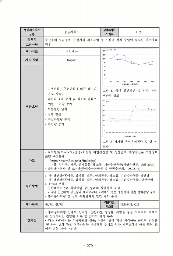 279 생태계서비스 구분 공급서비스 생태계서비 스 항목 어업 정책적 고려사항 수산물의 수급정책, 수산자원 회복사업 등 수산업 정책 수렵에 필요한 기초자료 제공 평가지표 어업생산 그림 1. 국내 일반해면 및 원양 어업 생산량 변화 그림 2. 시기별 총허용어획량 및 실 어 획량 지표 상태 Impact 변화요인 · 기후변화 지구온난화에 따른 해수면 온도 상승 · 국민의 소득 증가 및 식문화 변화로 인한 소비량 증가 · 무분별한 남획 · 질병 발생 · 수산자원량 부족 · 수입량 증가 자료 · 지역별 광역시?도/품종/어법별 어업생산량 및 생산금액해양수산부 수산정보 포털 수산통계 http//www.fips.go.kr/index.jsp 어류, 갑각류, 패류, 연체동물, 해조류, 기타수산동물 해양수산부, 1985-2014...
