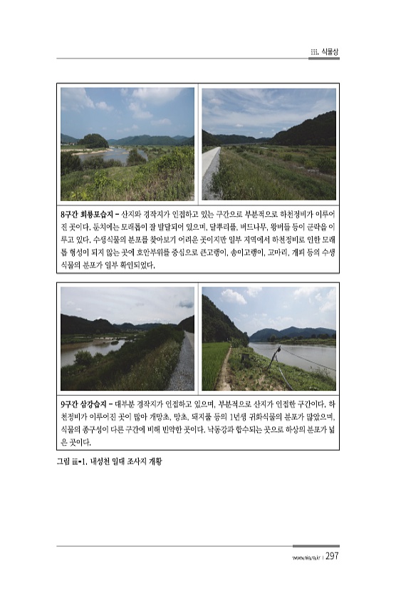 iii. 식물상 www.nie.re.kr ?297 8구간 회룡포습지 ? 산지와 경작지가 인접하고 있는 구간으로 부분적으로 하천정비가 이루어 진 곳이다. 둔치에는 모래톱이 잘 발달되어 있으며, 달뿌리풀, 버드나무, 왕버들 등이 군락을 이 루고 있다. 수생식물의 분포를 찾아보기 어려운 곳이지만 일부 지역에서 하천정비로 인한 모래 톱 형성이 되지 않는 곳에 호안부위를 중심으로 큰고랭이, 송이고랭이, 고마리, 개피 등의 수생 식물의 분포가 일부 확인되었다. 9구간 삼강습지 ? 대부분 경작지가 인접하고 있으며, 부분적으로 산지가 인접한 구간이다. 하 천정비가 이루어진 곳이 많아 개망초, 망초, 돼지풀 등의 1년생 귀화식물의 분포가 많았으며, 식물의 종구성이 다른 구간에 비해 빈약한 곳이다. 낙동강과 합수되는 곳으로 ...