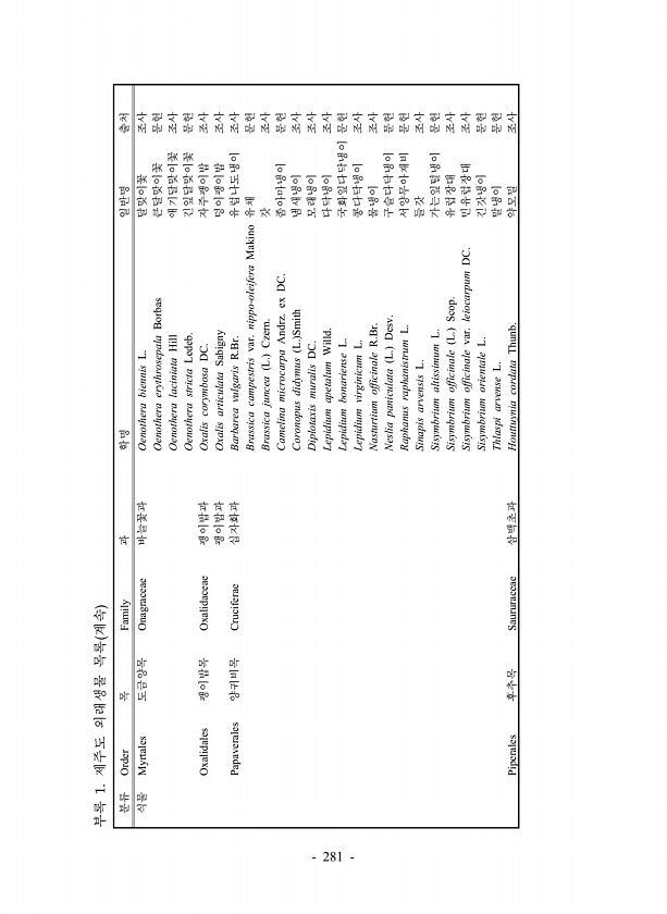 분류 Order 목 Family 과 학명 일반명 출처 식물 Myrtales 도금양목 Onagraceae 바늘꽃과 Oenothera biennis L. 달맞이꽃 조사 Oenothera erythrosepala Borbas 큰달맞이꽃 문헌 Oenothera laciniata Hill 애기달맞이꽃 조사 Oenothera stricta Ledeb. 긴잎달맞이꽃 문헌 Oxalidales 괭이밥목 Oxalidaceae 괭이밥과 Oxalis corymbosa DC. 자주괭이밥 조사 괭이밥과 Oxalis articulata Sabigny 덩이괭이밥 조사 Papaverales 양귀비목 Cruciferae 십자화과 Barbarea vulgaris R.Br. 유럽나도냉이 조사 Brassica campestris var. nip...