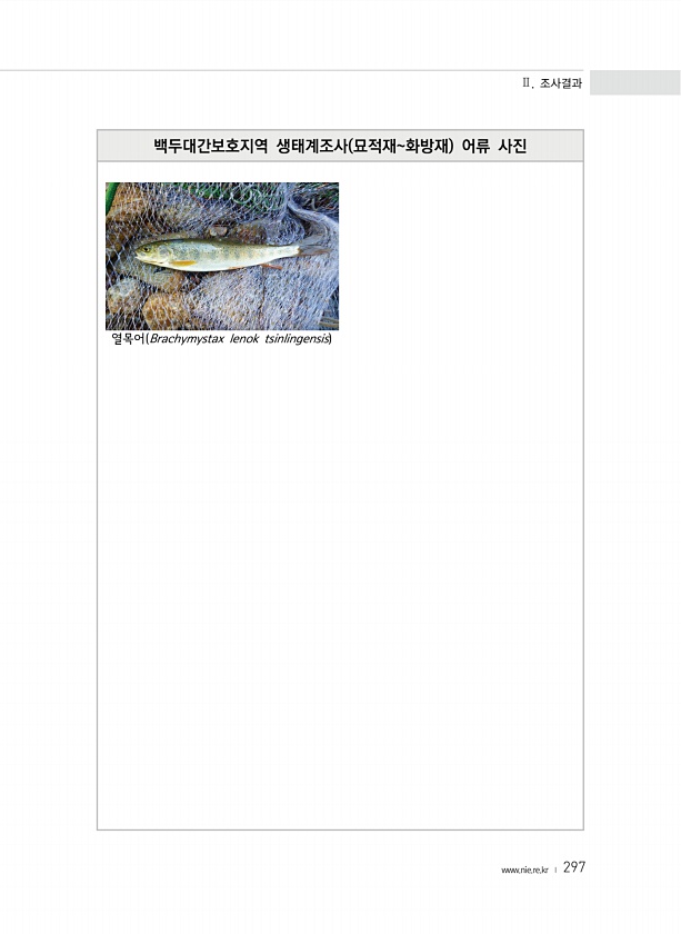 Ⅱ. 조사결과 www.nie.re.kr ? 297 백두대간보호지역 생태계조사 묘적재화방재 어류 사진 열목어 Brachymystax lenok tsinlingensis