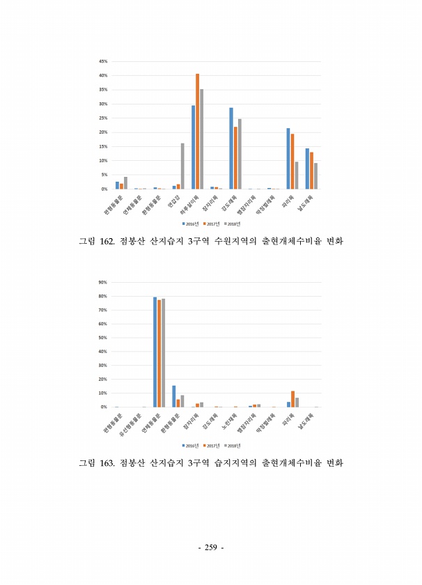 259 그림 162. 점봉산 산지습지 3구역 수원지역의 출현개체수비율 변화 그림 163. 점봉산 산지습지 3구역 습지지역의 출현개체수비율변화