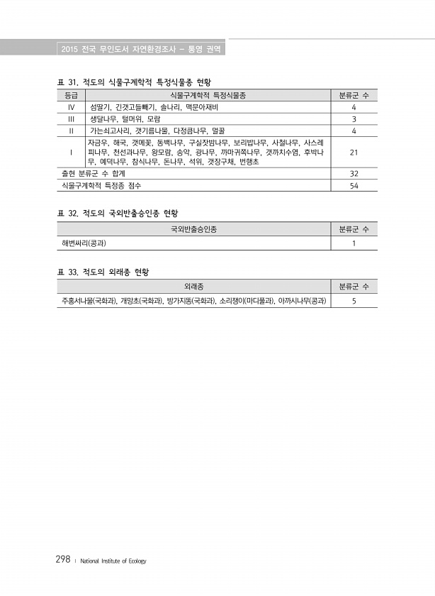 2015 전국 무인도서 자연환경조사 통영 권역 298 ? National Institute of Ecology 표 31. 적도의 식물구계학적 특정식물종 현황 등급 식물구계학적 특정식물종 분류군 수 IV 섬딸기, 긴갯고들빼기, 솔나리, 맥문아재비 4 III 생달나무, 털머위, 모람 3 II 가는쇠고사리, 갯기름나물, 다정큼나무, 멀꿀 4 I 자금우, 해국, 갯메꽃, 동백나무, 구실잣밤나무, 보리밥나무, 사철나무, 사스레 피나무, 천선과나무, 왕모람, 송악, 광나무, 까마귀쪽나무, 갯까치수염, 후박나 무, 예덕나무, 참식나무, 돈나무, 석위, 갯장구채, 번행초 21 출현 분류군 수 합계 32 식물구계학적 특정종 점수 54 표 32. 적도의 국외반출승인종 현황 국외반출승인종 분류군 수 해변싸리 콩과 1 표 33....