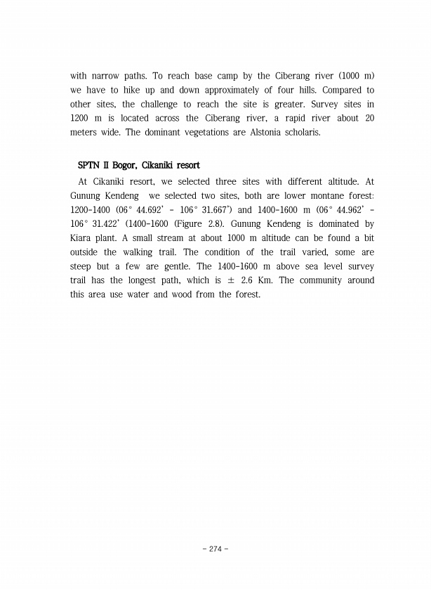 with narrow paths. To reach base camp by the Ciberang river 1000 m we have to hike up and down approximately of four hills. Compared to other sites, the challenge to reach the site is greater. Survey sites in 1200 m is located across the Ciberang river, a rapid river about 20 meters wide. The dominant vegetations are Alstonia scholaris. SPTN II Bogor, Cikaniki resort At Cikaniki resort, we selecte...