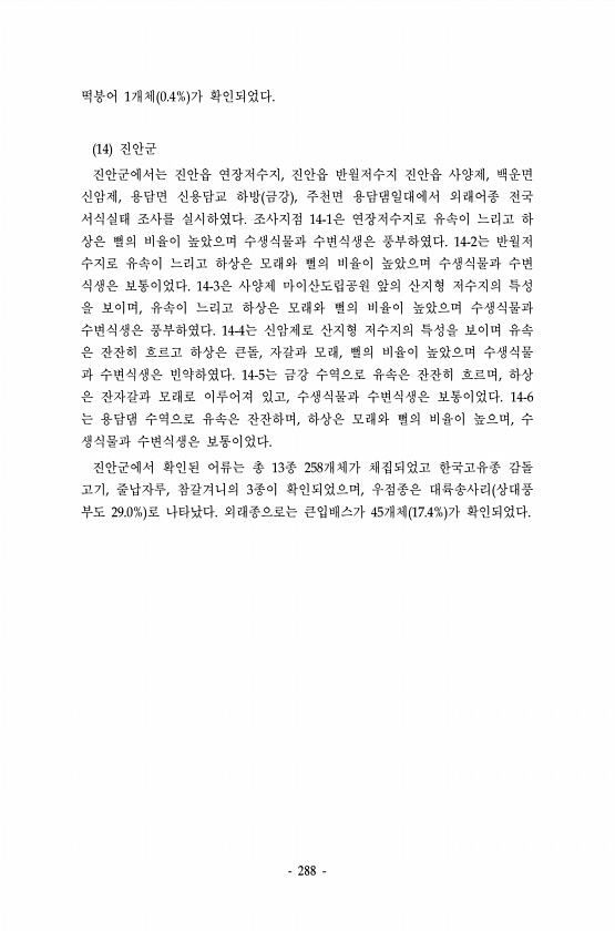 288 떡붕어 1개체 0.4% 가 확인되었다. 14 진안군 진안군에서는 진안읍 연장저수지, 진안읍 반월저수지 진안읍 사양제, 백운면 신암제, 용담면 신용담교 하방 금강 , 주천면 용담댐일대에서 외래어종 전국 서식실태 조사를 실시하였다. 조사지점 14-1은 연장저수지로 유속이 느리고 하 상은 뻘의 비율이 높았으며 수생식물과 수변식생은 풍부하였다. 14-2는 반월저 수지로 유속이 느리고 하상은 모래와 뻘의 비율이 높았으며 수생식물과 수변 식생은 보통이었다. 14-3은 사양제 마이산도립공원 앞의 산지형 저수지의 특성 을 보이며, 유속이 느리고 하상은 모래와 뻘의 비율이 높았으며 수생식물과 수변식생은 풍부하였다. 14-4는 신암제로 산지형 저수지의 특성을 보이며 유속 은 잔잔히 흐르고 하상은 큰돌, 자갈과 모래, ...