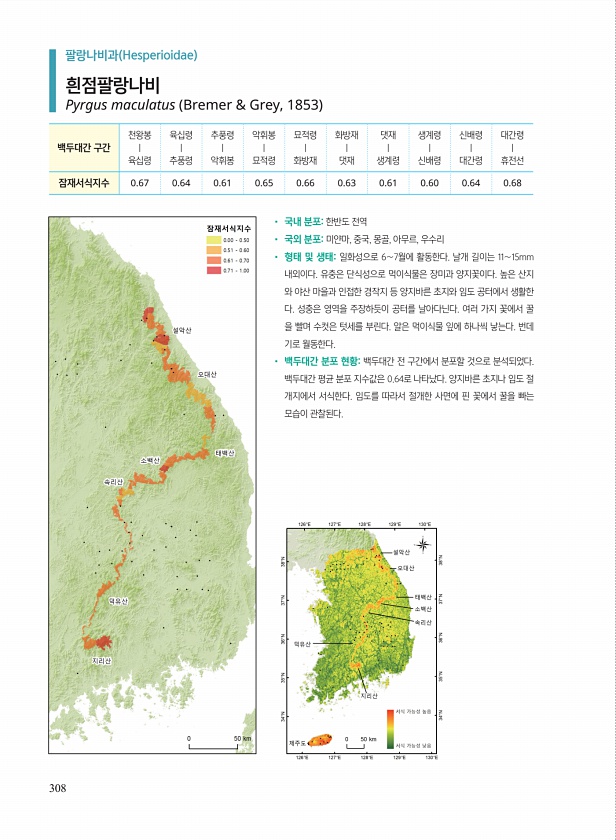 308 ? 국내 분포한반도 전역 ? 국외 분포미얀마, 중국, 몽골, 아무르, 우수리 ? 형태 및 생태일화성으로 6∼7월에 활동한다. 날개 길이는 11∼15mm 내외이다. 유충은 단식성으로 먹이식물은 장미과 양지꽃이다. 높은 산지 와 야산 마을과 인접한 경작지 등 양지바른 초지와 임도 공터에서 생활한 다. 성충은 영역을 주장하듯이 공터를 날아다닌다. 여러 가지 꽃에서 꿀 을 빨며 수컷은 텃세를 부린다. 알은 먹이식물 잎에 하나씩 낳는다. 번데 기로 월동한다. ? 백두대간 분포 현황백두대간 전 구간에서 분포할 것으로 분석되었다. 백두대간 평균 분포 지수값은 0.64로 나타났다. 양지바른 초지나 임도 절 개지에서 서식한다. 임도를 따라서 절개한 사면에 핀 꽃에서 꿀을 빠는 모습이 관찰된다. 백두대간 구간 천왕봉 ...