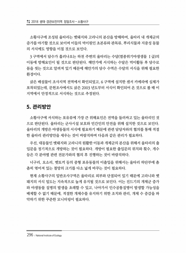 2018 생태·경관보전지역 정밀조사 소황사구 296 ? National Institute of Ecology 소황사구에 조성된 울타리는 멧돼지와 고라니의 분산을 방해하여, 울타리 내 개체군의 증가를 야기할 것으로 보이며 이들의 먹이원인 초본류와 관목류, 뿌리식물과 지중성 동물 의 서식에도 영향을 미칠 것으로 보인다. 3 구역에서 담수가 흘러나오는 하천 주변의 울타리는 수달 멸종위기야생생물 Ⅰ급 의 이동에 방해요인이 될 것으로 판단된다. 해안가에 서식하는 수달은 먹이활동 후 담수로 몸을 씻는 것으로 알려져 있기 때문에 해안가의 담수 수역은 수달의 서식을 위해 필요한 환경이다. 삵은 배설물이 조사지역 전역에서 확인되었고, 6 구역에 설치한 센서 카메라에 실체가 포착되었는데, 문헌조사에서도 삵은 2003 년도부터...