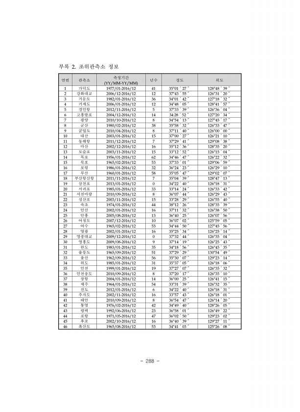 ? YY/MM-YY/MM 1 1977/01-2016/12 41 35°01′27″ 128°48′39″ 2 2006/12-2016/12 12 37°43′55″ 126°31′20″ 3 1982/01-2016/12 36 34°01′42″ 127°18′32″ 4 2006/01-2016/12 12 34°48′05″ 128°41′57″ 5 2012/11-2016/12 5 37°33′39″ 126°36′04″ 6 2004/12-2016/12 14 3428′52″ 127°20′34″ 7 2010/10-2016/12 8 34°54′13″ 127°45′17″ 8 1980/02-2016/12 38 35°58′32″ 126°33′47″ 9 2010/04-2016/12 8 37°11′40″ 126°00′00″ 10 2003/01-2...