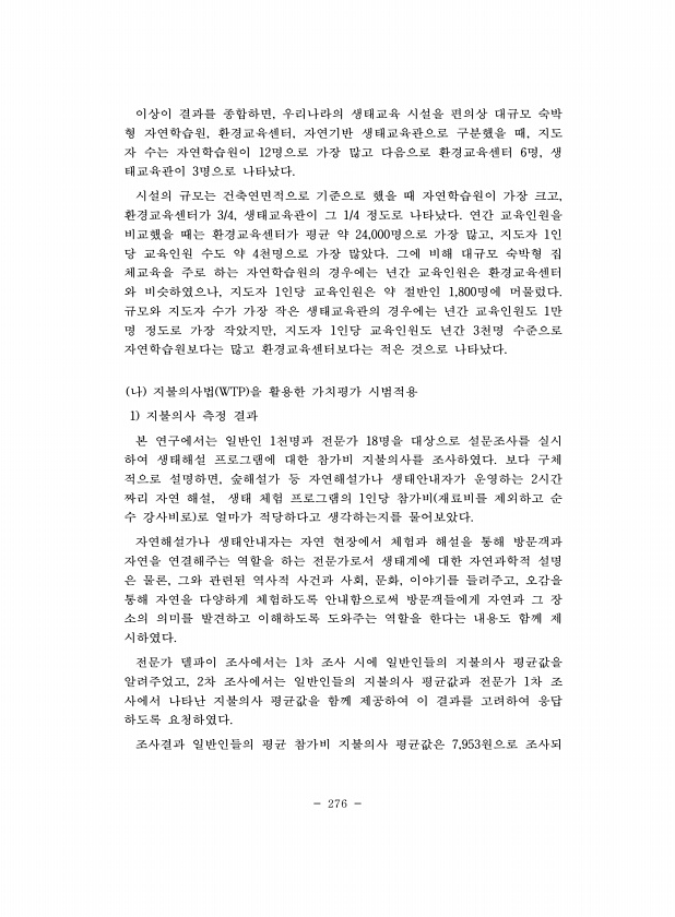 276 이상이 결과를 종합하면, 우리나라의 생태교육 시설을 편의상 대규모 숙박 형 자연학습원, 환경교육센터, 자연기반 생태교육관으로 구분했을 때, 지도 자 수는 자연학습원이 12명으로 가장 많고 다음으로 환경교육센터 6명, 생 태교육관이 3명으로 나타났다. 시설의 규모는 건축연면적으로 기준으로 했을 때 자연학습원이 가장 크고, 환경교육센터가 3/4, 생태교육관이 그 1/4 정도로 나타났다. 연간 교육인원을 비교했을 때는 환경교육센터가 평균 약 24,000명으로 가장 많고, 지도자 1인 당 교육인원 수도 약 4천명으로 가장 많았다. 그에 비해 대규모 숙박형 집 체교육을 주로 하는 자연학습원의 경우에는 년간 교육인원은 환경교육센터 와 비슷하였으나, 지도자 1인당 교육인원은 약 절반인 1,800명에 머물렀다. 규...