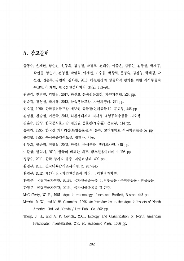 282 공동수 손세환 황순진 원두희 김명철 박정호 전태수 이종은 김종현 김종선 박재흥 , , , , , , , , , , , 곽인실 함순아 전영철 박영석 이재관 이수웅 박창희 문정숙 김진영 박혜경 박 , , , , , , , , , , 선진 권용주 김필재 김아름 하천환경의 생물학적 평가를 위한 저서동물지 , , , , 2018, 수 의 개발 한국물환경학회지 BMI , 34 2 183-201. 권순직 전영철 김명철 화살표 물속생물도감 자연과생태 , , , 2017, 224 pp. 권순직 전영철 박재흥 물속생물도감 자연과생태 , , , 2013, 791 pp. 권오길 한국동식물도감 제 권 동물편 연체동물 문교부 , 1990, 32 , 446 pp. Ⅰ 김명철 천승필 이존국 하천생태계와 저서성 대형무척추동물 지오...