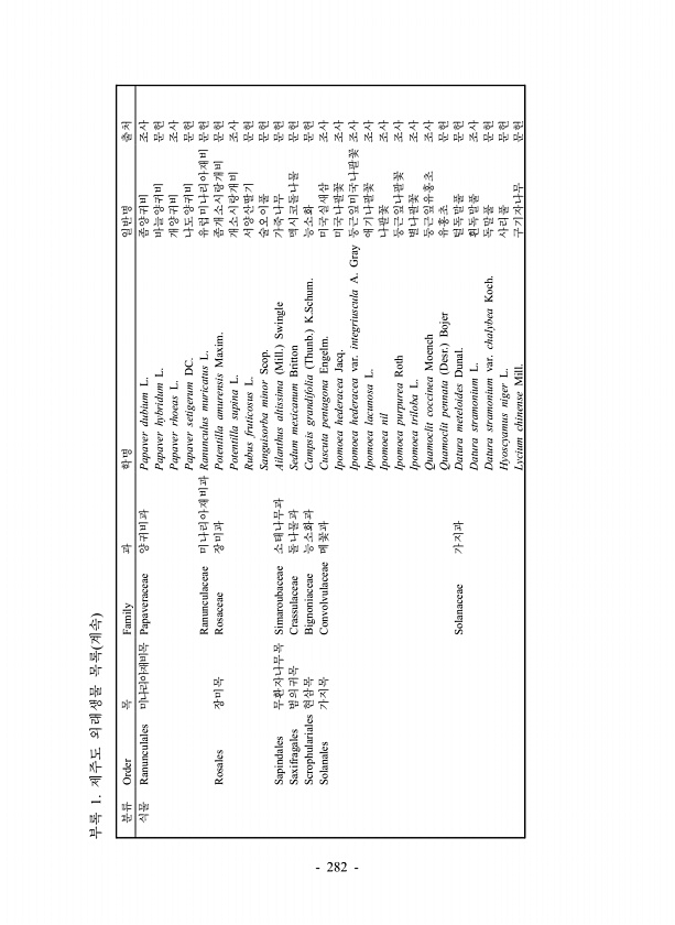 부록 1. 제주도 외래생물 목록 계속 분류 Order 목 Family 과 학명 일반명 출처 식물 Ranunculales 미나리아재비목 Papaveraceae 양귀비과 Papaver dubium L. 좀양귀비 조사 Papaver hybridum L. 바늘양귀비 문헌 Papaver rhoeas L. 개양귀비 조사 Papaver setigerum DC. 나도양귀비 문헌 Ranunculaceae 미나리아재비과 Ranunculus muricatus L. 유럽미나리아재비 문헌 Rosales 장미목 Rosaceae 장미과 Potentilla amurensis Maxim. 좀개소시랑개비 문헌 Potentilla supina L. 개소시랑개비 조사 Rubus fruticosus L. 서양산딸기 문헌 Sanguisorba m...