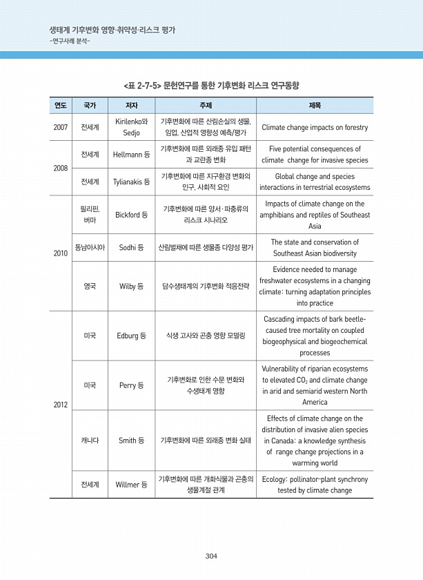 304 생태계 기후변화 영향·취약성·리스크 평가 -연구사례 분석- 표 2-7-5 문헌연구를 통한 기후변화 리스크 연구동향 연도 국가 저자 주제 제목 2007 전세계 Kirilenko와 Sedjo 기후변화에 따른 산림손실의 생물, 임업, 산업적 영향성 예측/평가 Climate change impacts on forestry 2008 전세계 Hellmann 등 기후변화에 따른 외래종 유입 패턴 과 교란종 변화 Five potential consequences of climate change for invasive species 전세계 Tylianakis 등 기후변화에 따른 지구환경 변화의 인구, 사회적 요인 Global change and species interactions in terrestrial ecos...