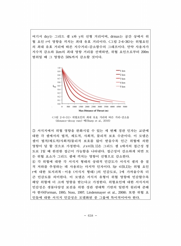 638 여기서 dxy는 그리드 셀 x와 y의 선형 거리이며, drmax는 공간 상에서 위 협 요인 r이 영향을 끼치는 최대 유효 거리이다. 그림 2-6-36 는 위협요인 의 최대 유효 거리에 따른 지수거리-감소함수의 그래프이다. 만약 사용자가 지수적 감소와 1km의 최대 영향 거리를 선택하면, 위협 요인으로부터 200m 범위일 때 그 영향은 50%까지 감소할 것이다. 그림 2-6-31 위협요인의 최대 유효 거리에 따른 거리-감소율 distance-decay rate 예 Sharp et al., 2016 ③ 서식지에서 위협 영향을 완화시킬 수 있는 세 번째 경관 인자는 교란에 대한 각 셀에서의 법적, 제도적, 사회적, 물리적 보호 수준이다. 이 모델은 셀이 법적/제도적/사회적/물리적 보호를 많이 받을수록 인근...