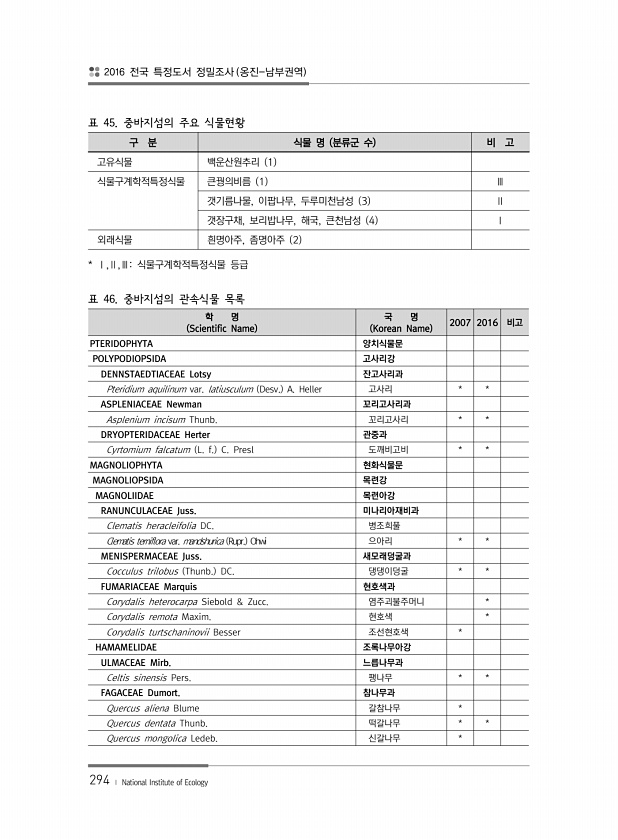 2016 전국 특정도서 정밀조사 옹진-남부권역 294 ? National Institute of Ecology 학 명 Scientific Name 국 명 Korean Name 2007 2016 비고 PTERIDOPHYTA 양치식물문 POLYPODIOPSIDA 고사리강 DENNSTAEDTIACEAE Lotsy 잔고사리과 Pteridium aquilinum var. latiusculum Desv. A. Heller 고사리 * * ASPLENIACEAE Newman 꼬리고사리과 Asplenium incisum Thunb. 꼬리고사리 * * DRYOPTERIDACEAE Herter 관중과 Cyrtomium falcatum L. f. C. Presl 도깨비고비 * * MAGNOLIOPHYTA 현화식물문 MAGNOLI...