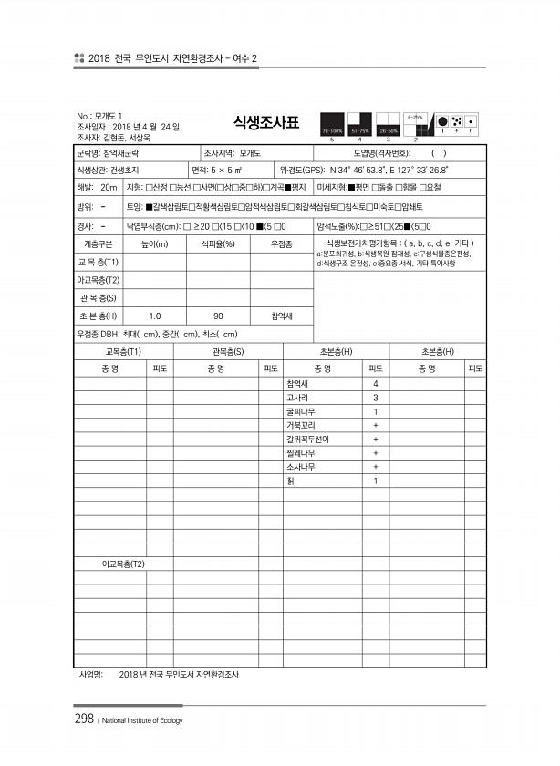 2018 전국 무인도서 자연환경조사 여수 2 298 ? National Institute of Ecology No 모개도 1 조사일자 2018 년 4 월 24 일 조사자김현돈, 서상욱 식생조사표 군락명참억새군락 조사지역모개도 도엽명 격자번호 식생상관건생초지 면적5 × 5 ㎡ 위?경도 GPS N 34° 4653.8, E 127° 3326.8해발20m 지형□산정 □능선 □사면 □상□중□하 □계곡■평지 미세지형■평면 □돌출 □함몰 □요철 방위토양■갈색삼림토□적황색삼림토□암적색삼림토□회갈색삼림토□침식토□미숙토□암쇄토 경사낙엽부식층 cm □.≥20 □ 15 □ 10 ■ 5 □0 암석노출 % □≥51□ 25■ 5□0 계층구분 높이 m 식피율 % 우점종 식생보전가치평가항목 a, b, c, d, e, 기타 a분포희귀성, ...
