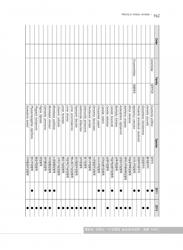296 Order Family Species 2011 2015 Cetoniidae 꽃무지과 Eucetonia pilifera 꽃무지 ● Gametis jucunda 풀색꽃무지 ● ● Glycyphana fulvistemma 검정꽃무지 ● Protaetia brevitarsis seulensis 흰점박이꽃무지 ● Chrysomelidae 잎벌레과 Agelastica coerulea 오리나무잎벌레 ● Altica oleracea 바늘꽃벼룩잎벌레 ● Aphthona strigosa 예덕나무애벼룩잎벌레 ● Aulacophora nigripennis 검정오이잎벌레 ● ● Basilepta fulvipes 금록색잎벌레 ● Cassida fuscorufa 적갈색남생이잎벌레 ● Cassida nebulosa...