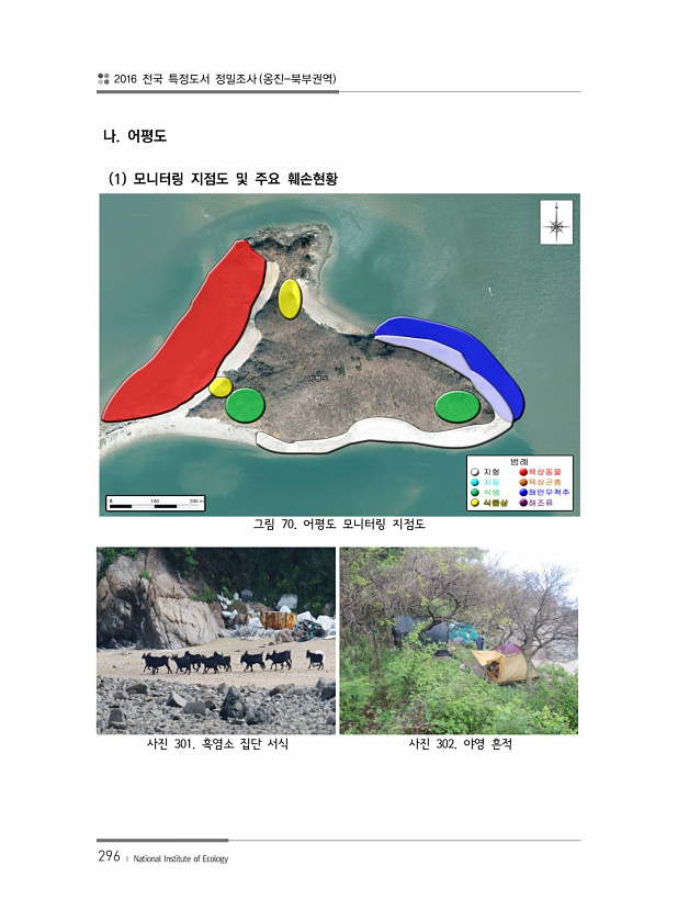 2016 전국 특정도서 정밀조사 옹진-북부권역 296 ? National Institute of Ecology 나. 어평도 1 모니터링 지점도 및 주요 훼손현황 그림 70. 어평도 모니터링 지점도 사진 301. 흑염소 집단 서식 사진 302. 야영흔적