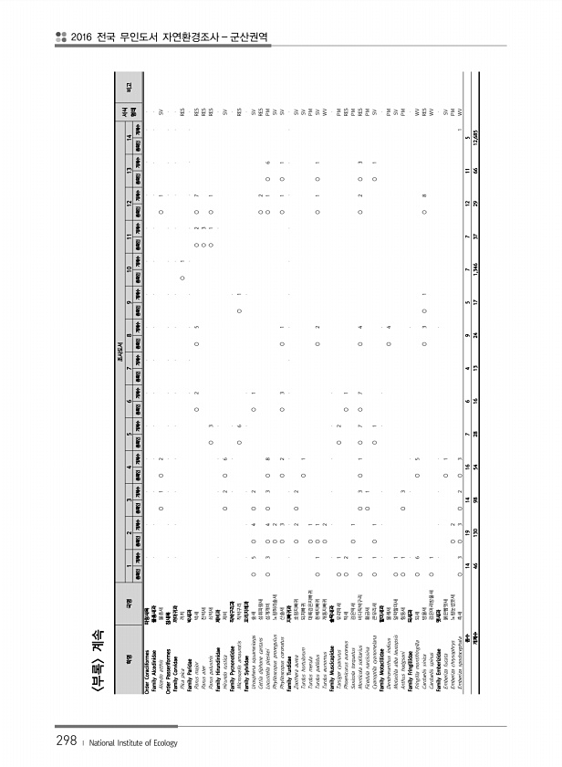 298 ? National Institute of Ecology 부록 계속 학명 국명 조사도서 서식 형태 1 2 3 4 5 6 7 8 9 10 11 12 13 14 비고 종확인 개체수 종확인 개체수 종확인 개체수 종확인 개체수 종확인 개체수 종확인 개체수 종확인 개체수 종확인 개체수 종확인 개체수 종확인 개체수 종확인 개체수 종확인 개체수 종확인 개체수 종확인 개체수 Order Coraciiformes 파랑새목 Family Alcedinidae 물총새과 Alcedo atthis 물총새 ○ 1 ○ 2 ○ 1 SV Order Passeriformes 참새목 Family Corvidae 까마귀과 Pica pica 까치 ○ 1 RES Family Paridae 박새과 Parus major 박새 ○ 2 ○ 5 ○ 2...