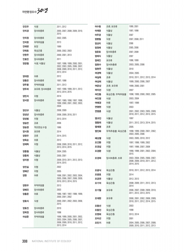 안진우 식생 2011; 2012 안치경 양서파충류 2005; 2007; 2008; 2009; 2010; 2015 안치정 양서파충류 2002; 2005 안치현 무척추동물 2013 안태변 토양 1989 안태호 육상곤충 2000; 2002; 2003 안현주 양서파충류 2000; 2001; 2013 안효민 양서파충류 2011 양금철 식생; 식물상 1997; 1998; 1999; 2000; 2001; 2002; 2003; 2005; 2006; 2007; 2008; 2009; 2010; 2011; 2012; 2013; 2014 양대창 어류 2012 양동은 양서파충류 1997; 1998 양두용 무척추동물 2011; 2013 양두하 포유류; 양서파충류 1997; 1998; 1999; 2011; 2012; 2013; 201...