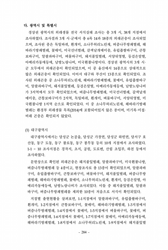 다. 광역시 및 특별시 경상권 광역시의 외래생물 전국 서식실태 조사는 총 3개 시, 38개 지점에서 조사하였다. 조사결과 3개 시·군에서 총 6목 14과 18종의 외래곤충이 조사되었 으며, 조사된 종은 독일바퀴, 흰개미, 소나무허리노린재, 버즘나무방패벌레, 해 바라기방패벌레, 꽃매미, 미국선녀벌레, 갈색날개매미충, 유럽좁쌀바구미, 큰뚱 보바구미, 알팔파바구미, 벼물바구미, 돼지풀잎벌레, 서양뒤영벌, 등검은말벌, 아메리카동애등에, 남방노랑나비, 미국흰불나방이다. 경상권 광역시의 3개 시· 군 모두에서 외래곤충이 확인되었으며, 이 중 울산에서 14종으로 상대적으로 많은 외래곤충이 확인되었다. 이어서 대구와 부산이 13종으로 확인되었다. 조 사된 외래곤충 중 소나무허리노린재, 해바라기방패벌레, 꽃매미, 유럽좁쌀바...
