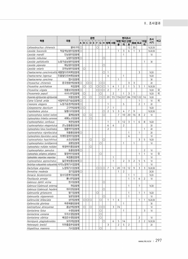 Ⅱ. 조사결과 www.nie.re.kr ? 297 학명 국명 문헌 현지조사 조사 A B C D E F G H 빙애 사동 덕현 시기 비고 골 덕산 리 산명 호 동송 토교 이길 리 Callosobruchus chinensis 팥바구미 ○ ○ 3 12 30 1d,2d,3d Cassida fuscorufa 적갈색남생이잎벌레 ○ 1 3 6 1 3 1d,2d,3d Cassida mandli 민남생이잎벌레 1 1d Cassida nebulosa 남생이잎벌레 ○ ○ Cassida pallidicollis 노랑가슴남생이잎벌레 1 3d Cassida piperata 애남생이잎벌레 ○ Cassida velaris 꼬마남생이잎벌레 ○ Chaetocnema concinnicollis 세줄털다리벼룩잎벌레 ○ 1 3 1d,2d Cha...