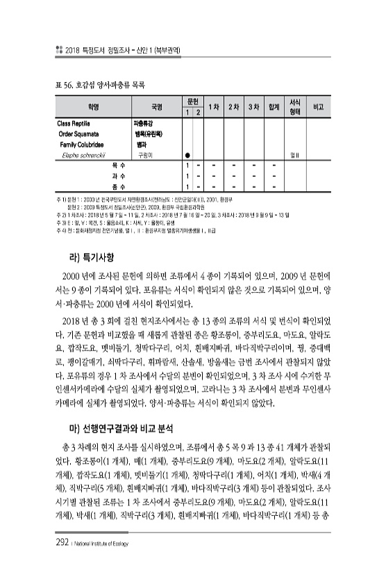 2018 특정도서 정밀조사 신안 1 북부권역 292 ? National Institute of Ecology 학명 국명 문헌 1 차 2 차 3 차 합계 서식 1 2 형태 비고 Class Reptilia 파충류강 Order Squamata 뱀목 유린목 Family Colubridae 뱀과 Elaphe schrenckii 구렁이 ● 멸Ⅱ 목 수 1 과 수 1 종 수 1 표 56. 호감섬 양서?파충류 목록 주 1 문헌 1 2000 년 전국무인도서 자연환경조사 전라남도 신안군일대 Ⅱ , 2001, 환경부 문헌 2 2009 특정도서 정밀조사 신안군 , 2009, 환경부 국립환경과학원 주 2 1 차조사 2018 년 5 월 7 일 11 일, 2 차조사 2018 년 7 월 16 일 20 일, 3 차조사 2018 년 9 월...
