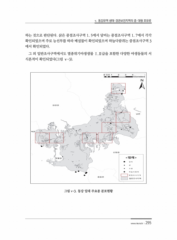 v. 동강유역 생태·경관보전지역의 중·대형 포유류 www.nie.re.kr ?295 하는 것으로 판단된다. 삵은 중점조사구역 1, 5에서 담비는 중점조사구역 1, 7에서 각각 확인되었으며 주로 능선부를 따라 배설물이 확인되었으며 하늘다람쥐는 중점조사구역 3 에서 확인되었다. 그 외 일반조사구역에서도 멸종위기야생생물 Ⅰ,Ⅱ급을 포함한 다양한 야생동물의 서 식흔적이 확인되었다 그림 ⅴ-3 그림 v-3. 동강 일대 주요종분포현황