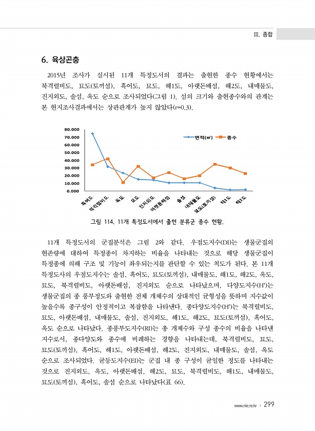 Ⅲ. 종합 www.nie.re.kr ? 299 6. 육상곤충 2015년 조사가 실시된 11개 특정도서의 결과는 출현한 종수 현황에서는 북격렬비도, 묘도 토끼섬 , 흑어도, 묘도, 해1도, 아랫돈배섬, 해2도, 내매물도, 진지외도, 솔섬, 옥도 순으로 조사되었다 그림 1 섬의 크기와 출현종수와의 관계는 본 현지조사결과에서는 상관관계가 높지 않았다 r=0.3 0.000 10.000 20.000 30.000 40.000 50.000 60.000 70.000 80.000 면적 ㎡ 종수 그림 114. 11개 특정도서에서 출현 분류군 종수 현황. 11개 특정도서의 군집분석은 그림 2와 같다. 우점도지수 DI 는 생물군집의 현존량에 대하여 특정종이 차지하는 비율을 나타내는 것으로 해당 생물군집이 특정종에 의해 구조 및 ...