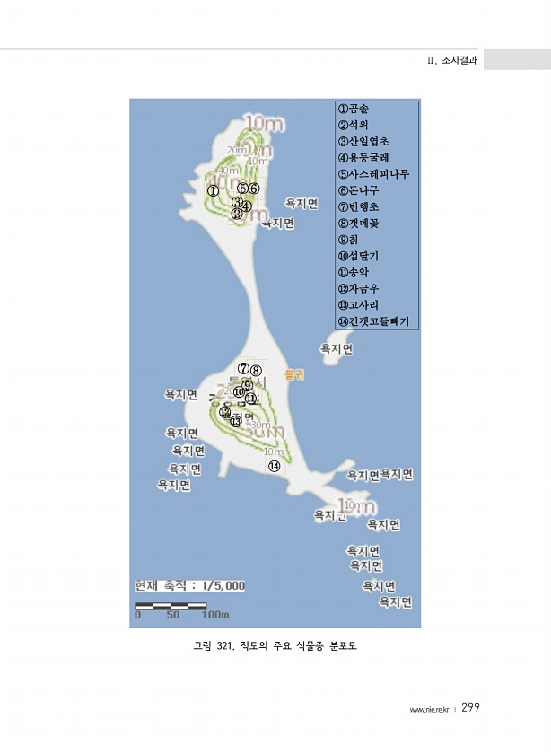 Ⅱ. 조사결과 www.nie.re.kr ? 299 ③④② ① ⑤⑥ ⑦⑧ ⑨ ⑩ ⑫⑬ ⑪ ⑭ ①곰솔 ②석위 ③산일엽초 ④용둥굴레 ⑤사스레피나무 ⑥돈나무 ⑦번행초 ⑧갯메꽃 ⑨칡 ⑩섬딸기 ⑪송악 ⑫자금우 ⑬고사리 ⑭긴갯고들빼기 그림 321. 적도의 주요 식물종분포도
