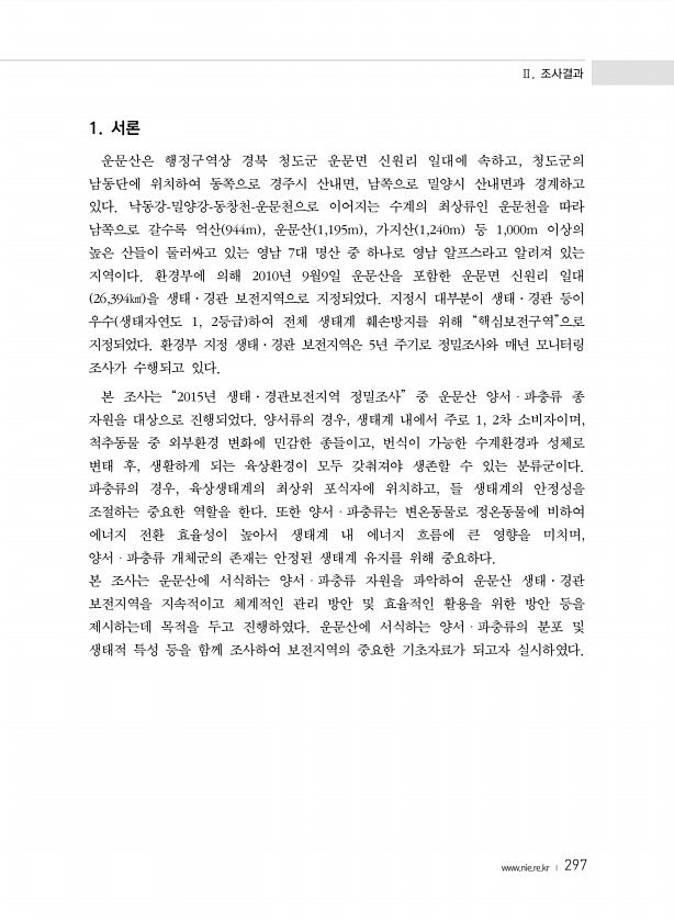 Ⅱ. 조사결과 www.nie.re.kr ? 297 1. 서론 운문산은 행정구역상 경북 청도군 운문면 신원리 일대에 속하고, 청도군의 남동단에 위치하여 동쪽으로 경주시 산내면, 남쪽으로 밀양시 산내면과 경계하고 있다. 낙동강-밀양강-동창천-운문천으로 이어지는 수계의 최상류인 운문천을 따라 남쪽으로 갈수록 억산 944m , 운문산 1,195m , 가지산 1,240m 등 1,000m 이상의 높은 산들이 둘러싸고 있는 영남 7대 명산 중 하나로 영남 알프스라고 알려져 있는 지역이다. 환경부에 의해 2010년 9월9일 운문산을 포함한 운문면 신원리 일대 26,394㎢ 을 생태·경관 보전지역으로 지정되었다. 지정시 대부분이 생태·경관 등이 우수 생태자연도 1, 2등급 하여 전체 생태계 훼손방지를 위해 “핵심보전구역”으...