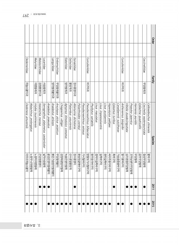 297 Order Family Species 2011 2015 Callosobruchus chinensis 팥바구미 ● Coccinellidae 무당벌레과 Coccinella septempunctata 칠성무당벌레 ● ● Epilachna quadricollis 곱추무당벌레 ● Harmonia axyridis 무당벌레 ● Propylea japonica 꼬마남생이무당벌레 ● ● Vibidia duodecimguttata 십이흰점무당벌레 ● Curculionidae 바구미과 Anthonomus bisignifer 딸기꽃바구미 ● Caradipennis sulcithorax 가슴골좁쌀바구미 ● Episomus turritus 혹바구미 ● Hyperstylus pallipes 싸리주둥이바구미 ●...