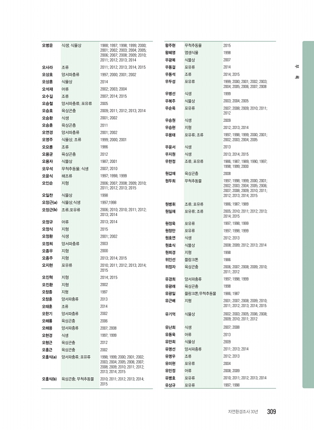 오병운 식생; 식물상 1988; 1997; 1998; 1999; 2000; 2001; 2002; 2003; 2004; 2005; 2006; 2007; 2008; 2009; 2010; 2011; 2012; 2013; 2014 오사라 조류 2011; 2012; 2013; 2014; 2015 오상호 양서파충류 1997; 2000; 2001; 2002 오상훈 식물상 2014 오석재 어류 2002; 2003; 2004 오수길 조류 2007; 2014; 2015 오승철 양서파충류; 포유류 2005 오승호 육상곤충 2009; 2011; 2012; 2013; 2014 오승환 식생 2001; 2002 오승훈 육상곤충 2011 오연경 양서파충류 2001; 2002 오영주 식물상; 조류 1999; 2000; 2001 오요륜 조...